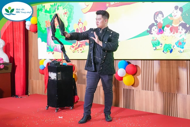 Chiều 1/10, không gian Hội trường J – Bệnh viện Nhi Trung ương như được khoác lên một tấm áo mới, rực rỡ sắc màu và ngập tràn thanh âm tươi vui. Những gương mặt thơ ngây bừng sáng niềm háo hức khi cùng cha mẹ hòa mình vào các tiết mục ảo thuật, ca múa nhạc đặc sắc. Dường như mọi mệt mỏi, đau đớn đều tan biến, chỉ còn lại những đôi mắt trong veo lấp lánh niềm vui. Có em nhỏ tay còn cắm dây truyền dịch vẫn cố vỗ tay theo nhịp, có bé vừa trải qua đợt hóa trị vẫn say sưa theo dõi màn ảo thuật kỳ diệu. Những chiếc xe lăn hôm nay đã trở thành chỗ ngồi đặc biệt nhất trong ngày hội của riêng các em.