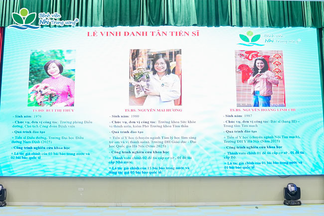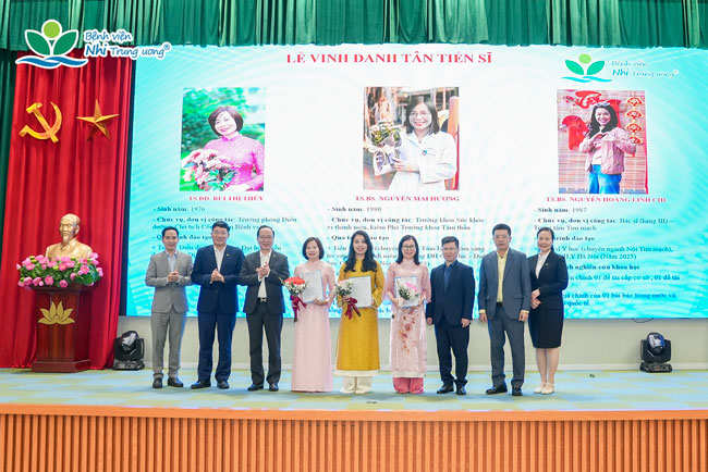 Ba tân Tiến sĩ được vinh danh là những cán bộ đang trực tiếp công tác, giữ vai trò quan trọng trong nhiều lĩnh vực chuyên môn và quản lý của Bệnh viện. Thành quả nghiên cứu khoa học của các bác sĩ đã góp phần làm phong phú thêm kho tàng tri thức y học, đồng thời có giá trị thực tiễn cao trong công tác chăm sóc và bảo vệ sức khỏe trẻ em.