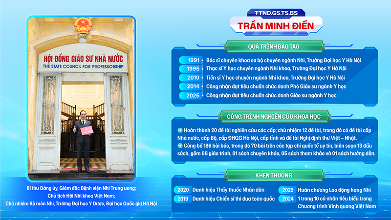 Trong số các cá nhân được vinh danh có TTND.GS.TS.BS Trần Minh Điển – Giám đốc Bệnh viện Nhi Trung ương, Chủ tịch Hội Nhi khoa Việt Nam, Chủ nhiệm Bộ môn Nhi – Trường Đại học Y Dược, Đại học Quốc gia Hà Nội là gương mặt tiêu biểu. Không chỉ có những đóng góp xuất sắc trong lĩnh vực chuyên môn về Nhi khoa và quản lý y tế, tân Giáo sư còn hoàn thành 20 đề tài nghiên cứu các cấp; công bố 186 bài báo, trong đó 70 bài trên các tạp chí quốc tế uy tín; biên soạn 13 đầu sách chuyên ngành; hướng dẫn 12 nghiên cứu sinh bảo vệ thành công luận án tiến sĩ. Ông là hình mẫu tiêu biểu cho thế hệ thầy thuốc – nhà giáo – nhà khoa học của Bệnh viện.