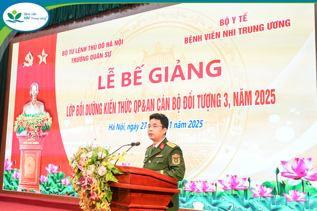 PGS.TS Phạm Duy Hiền – Phó Giám đốc, Chính trị viên Ban Chỉ huy Quân sự Bệnh viện Nhi Trung ương ghi nhận và đánh giá cao tinh thần làm việc nghiêm túc, chuyên nghiệp của các giảng viên và học viên trong toàn bộ quá trình học tập; khẳng định lớp học đã giúp cán bộ của Bệnh viện nâng cao nhận thức về quốc phòng, an ninh, ý thức trách nhiệm công dân, tăng cường phối hợp với lực lượng quân đội, công an; đồng thời cam kết sẽ vận dụng hiệu quả kiến thức vào quản lý, điều hành, góp phần xây dựng môi trường bệnh viện an toàn, văn minh, hiện đại.